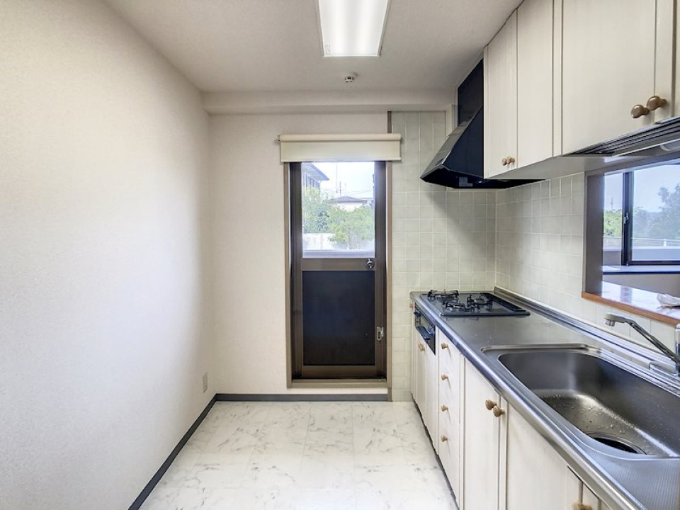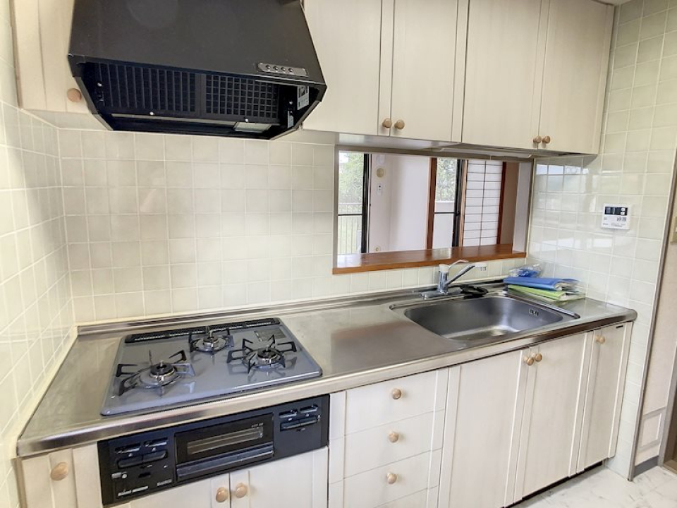 トーンを合わせたホワイトのシステムキッチンは、3口のガスコンロにグリル付き、シンクも広めで作業スペースも確保されています。