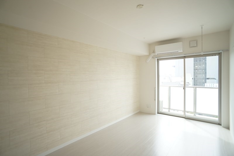 オシャレな雰囲気を醸し出してくれそうなコンクリート打ちっ放し風のアクセントクロスと、ドアや窓枠が赤という特徴的な居室です。