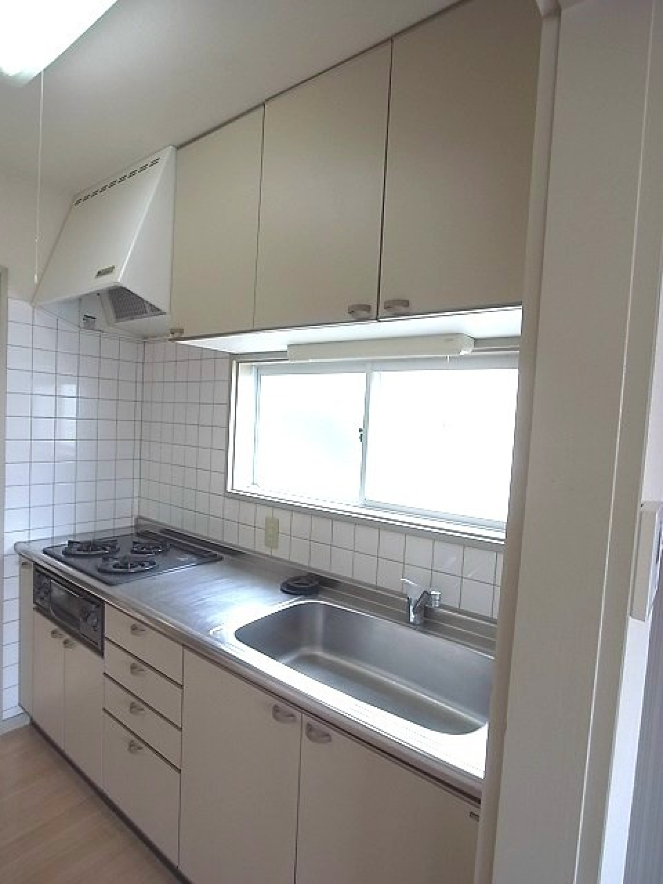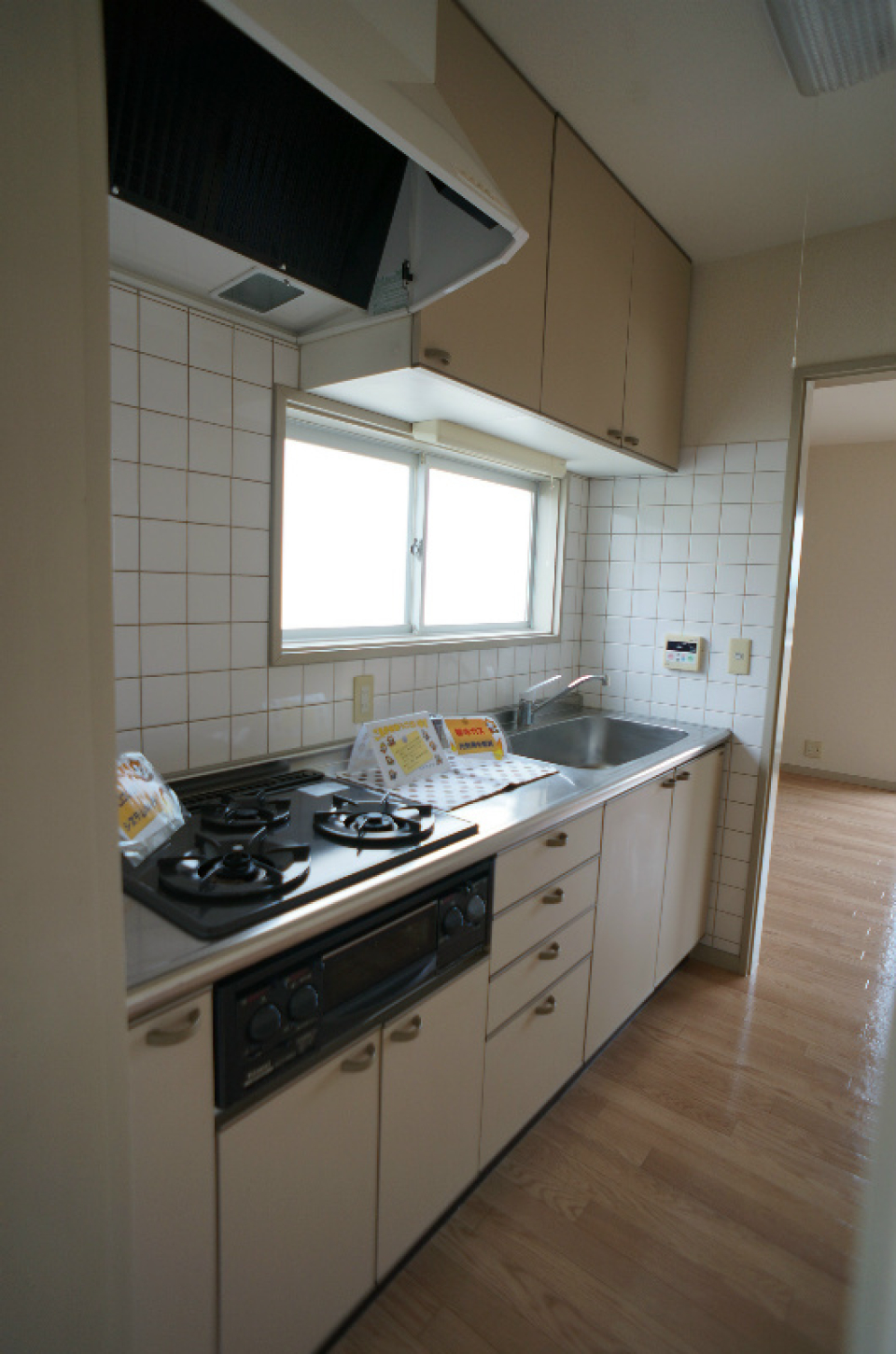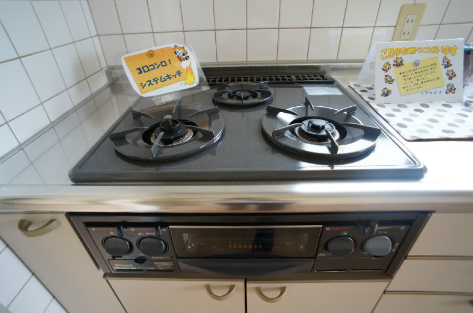 ガスコンロは設置されていないので、お好きなサイズのコンロを置くことができます。お勧めは3口コンロタイプです。