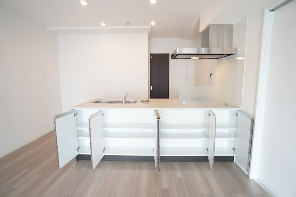 真っ白なキッチンはシンクがとても広く収納も充実した、自炊する方にはうれしいキッチンです。