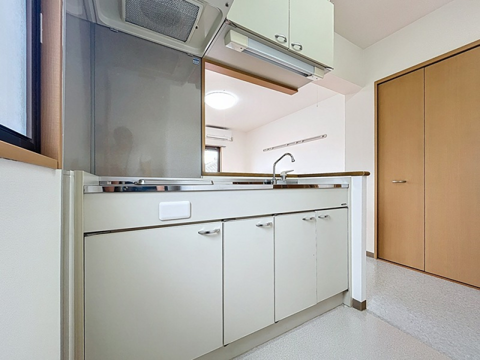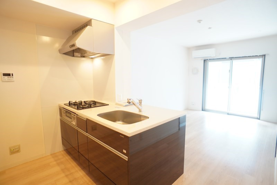 壁付けのシステムキッチンは2100mmの幅があり、3口ガスコンロでお料理もしっかり楽しめます。