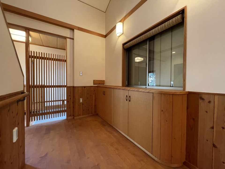 ですが、玄関の扉を開けて一歩中に入ってみると、そこには木の香りが漂うコテージ風の空間が広がります。