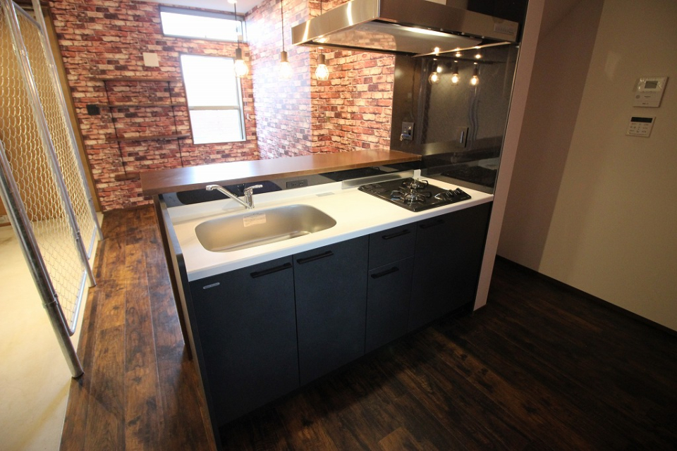 キッチンは木目調の対面式デザイン。お料理をしながら家族や友人との会話を楽しむことができます。さらに、ダウンライトのみの照明が、落ち着いた雰囲気を醸し出し、毎日の料理が一段と楽しくなるでしょう。