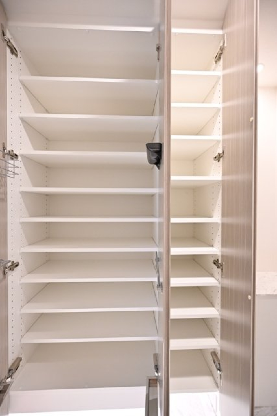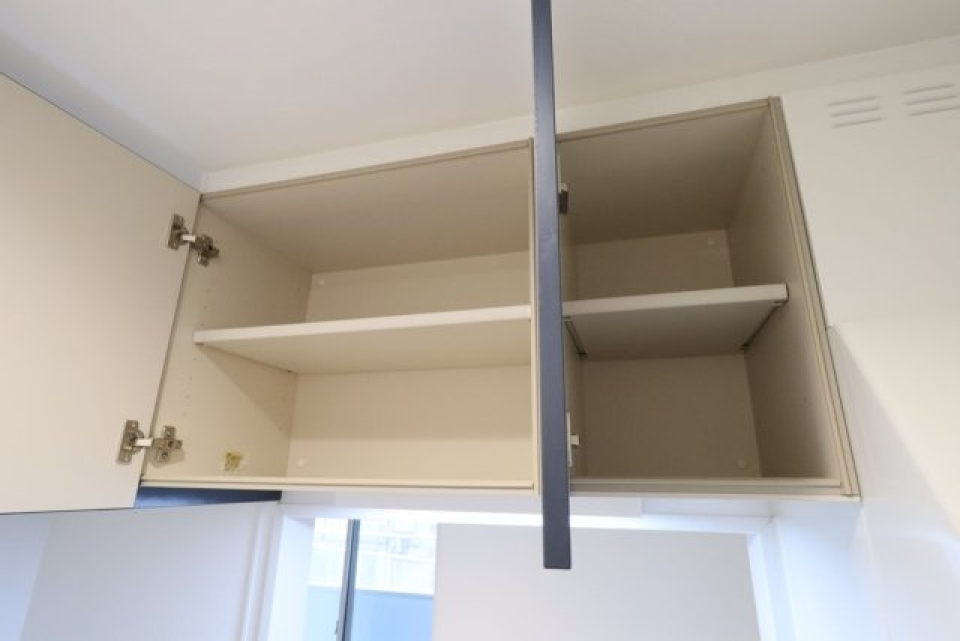 対面式のキッチンの背面には立派なカップボードがあり、食器や調理器具はこちらにまるっと収まりそう。