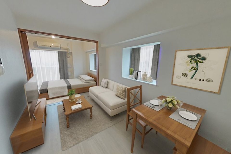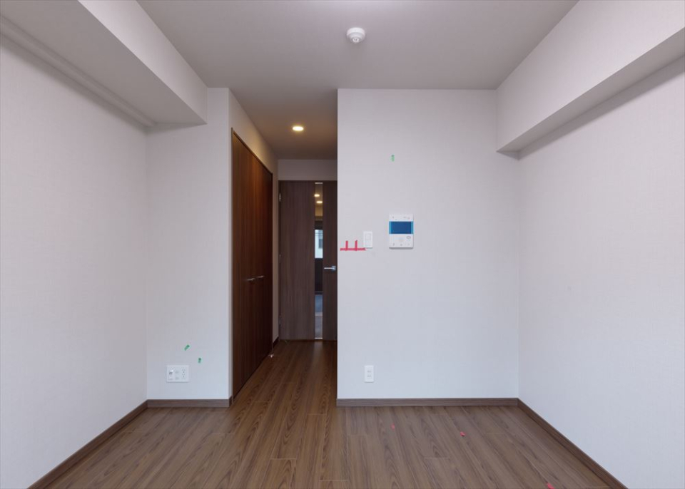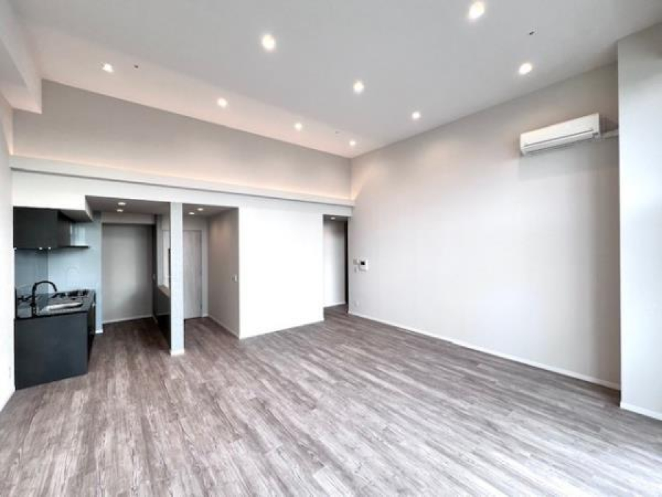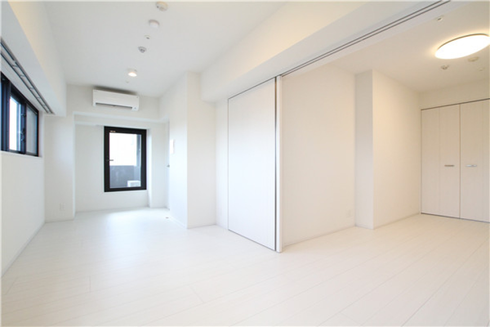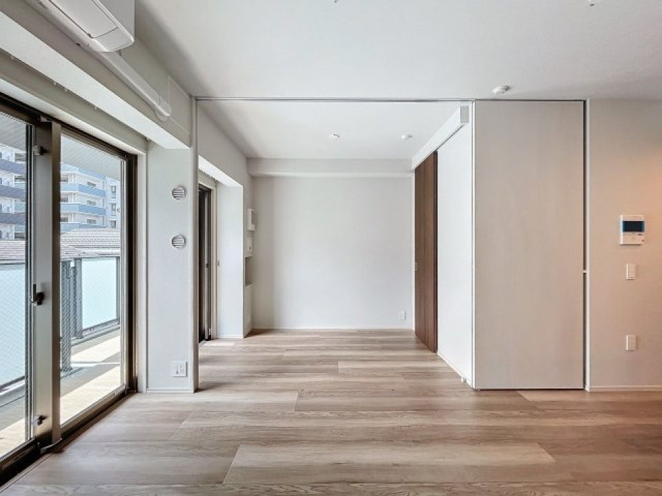 12.4帖のLDKと4.8帖のベッドルームからなる1LDKですが、普段は引き戸を開いて17.2帖の広々ワンルームとして使うのも良さそう。