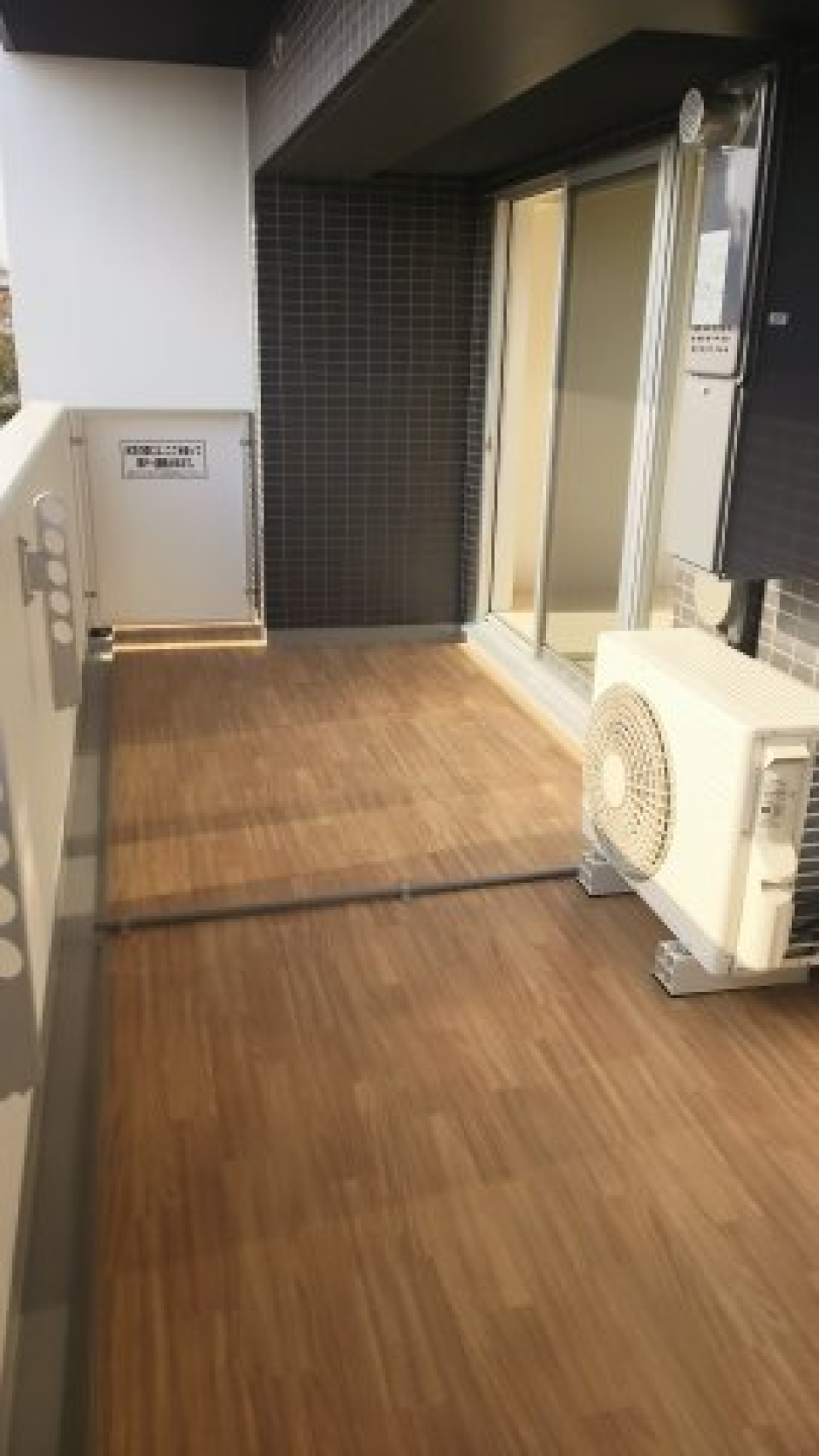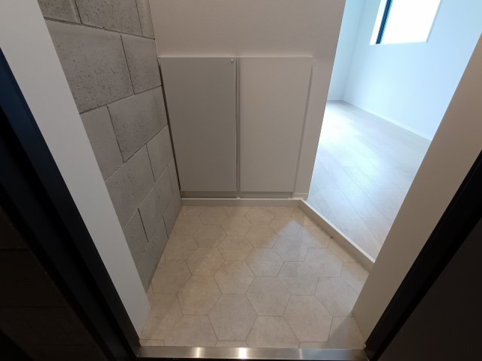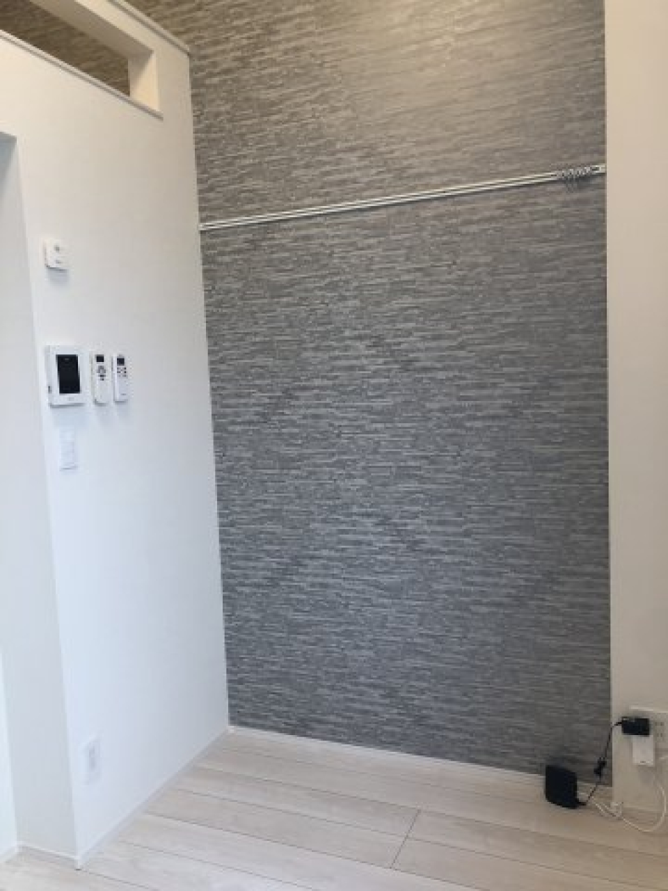 グレーのブリックタイルとボルドーパイン材のフローリングの組み合わせが無機質×温かみのグッドマッチング。