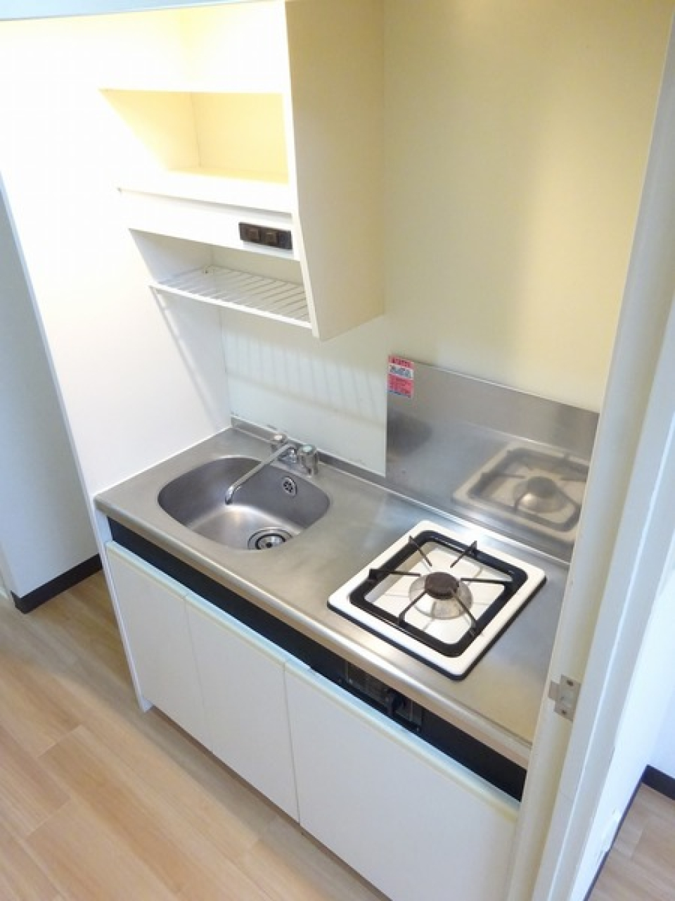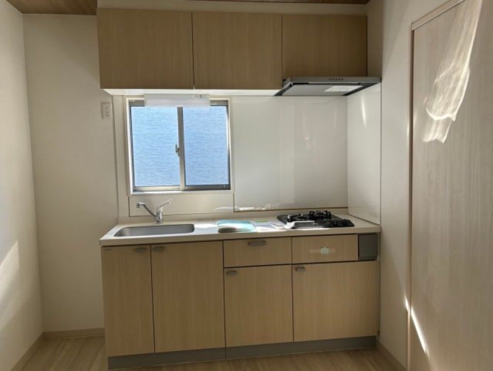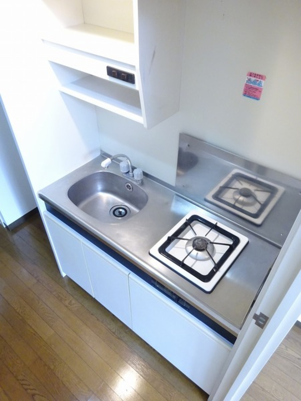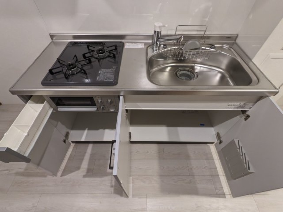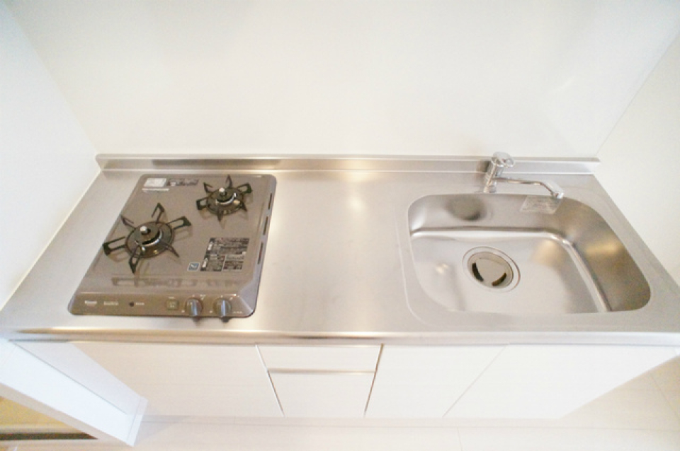 2口のガスコンロが設置されていて、自炊するにもゆとりあるワークトップで料理ができますね。