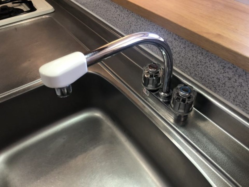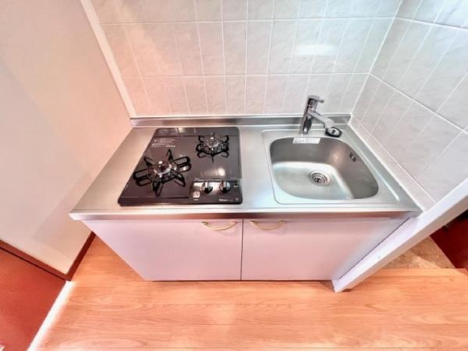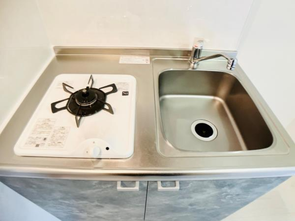 2口のコンロ。シンクの上にボードを置いて作業場を確保できる工夫ができそうですね!