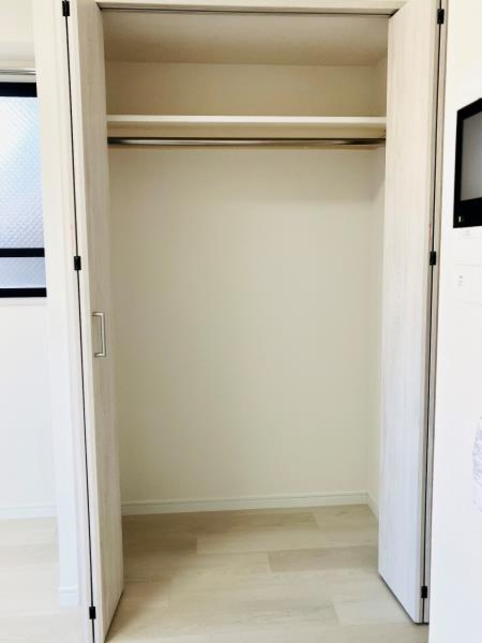 落ち着いたトーンのフロアにホワイトの壁紙。シンプルで住みやすそうな空間です。