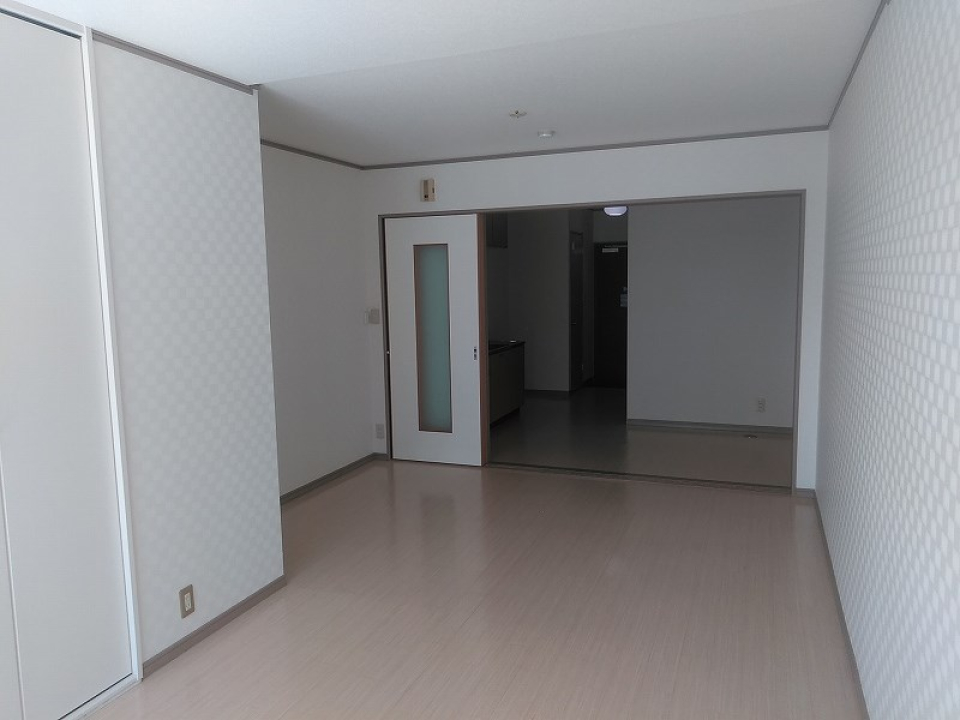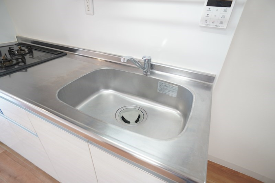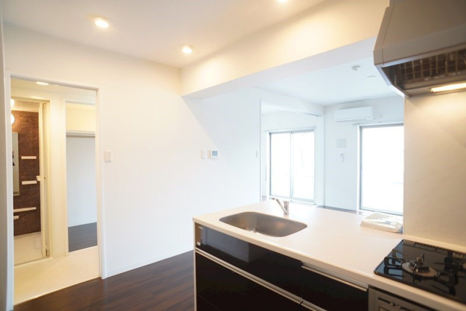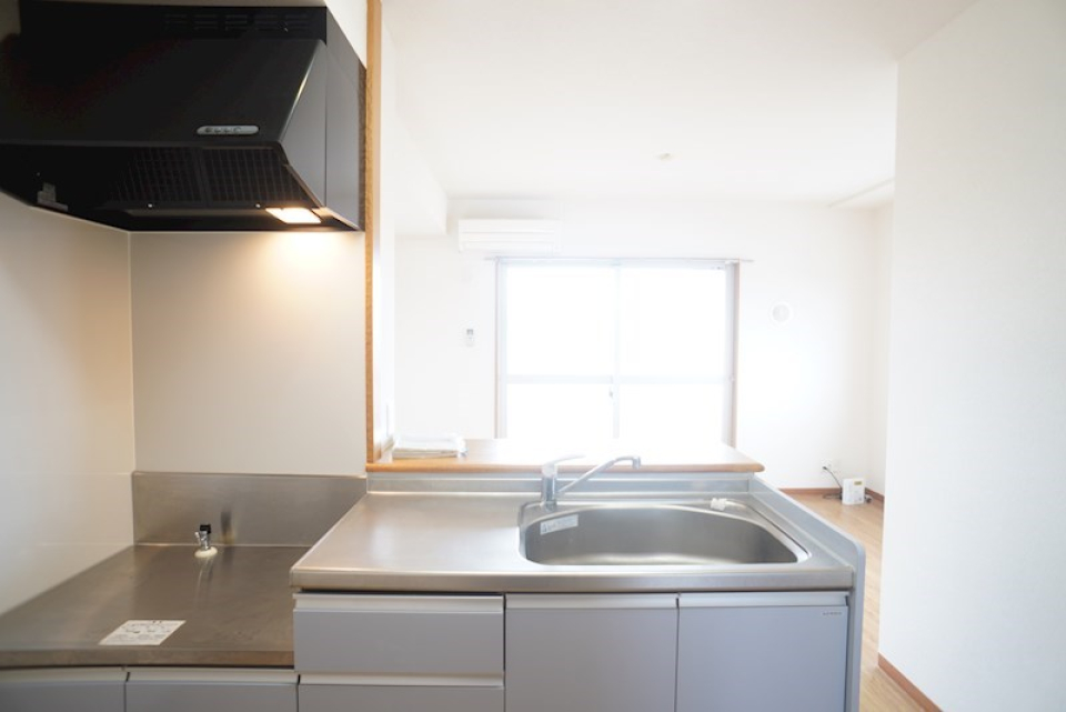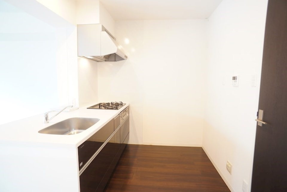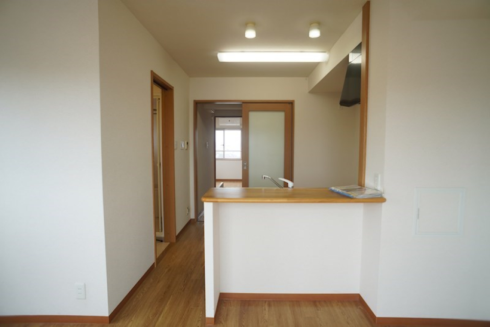 6.0帖のダイニングキッチンは3口のガスコンロが設置されています。ダイニングキッチンの隣には7.0帖の洋室が、折戸のスライドドアを隔ててあります。キッチンは対面式なので、洋室の扉を開けるとキッチンから洋室を眺めることができます。