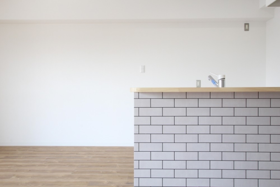 キッチンスペースはフロアが白いタイルに切り替えられており、掃除もしやすいしデザイン的にもかわいいです。