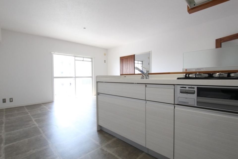 キッチンにはご自身のお好きなコンロを設置することが可能です。キッチンの目の前には窓があり、電気を付けなくても明るいです。