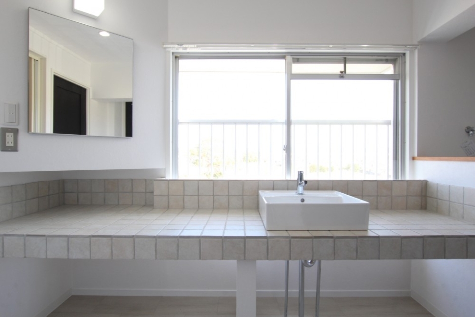 ここまで大胆にスペースを使った洗面台、しかもタイル貼りでかわいい、、。