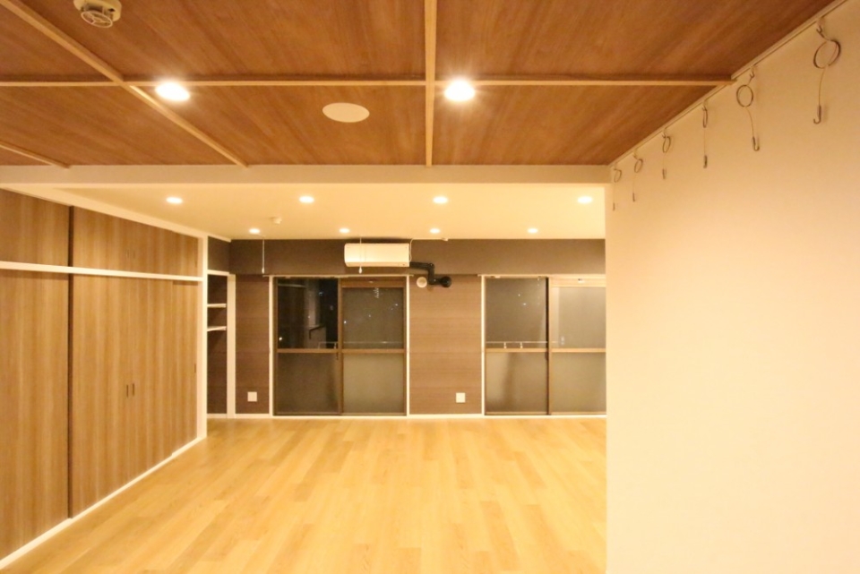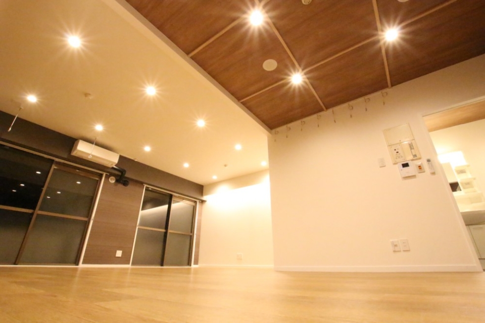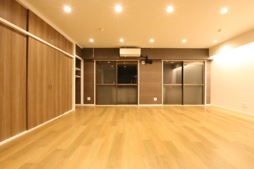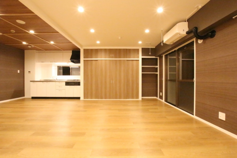 リビングはなんと25帖あり、キッチンは広々スペースを確保。床もいい感じのフローリングで高級感がありました。