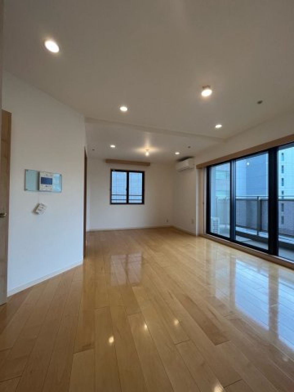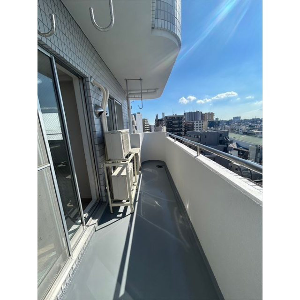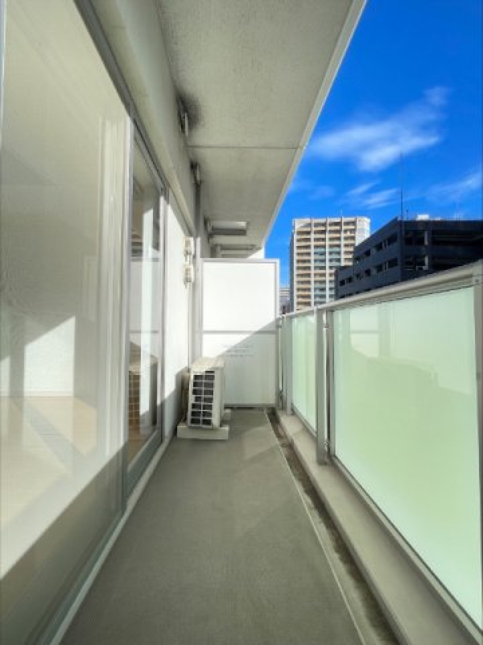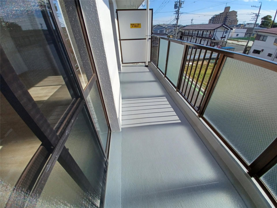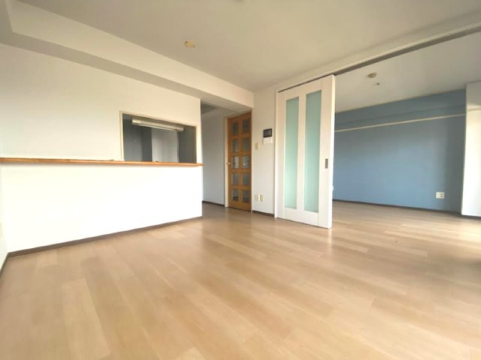 細長いリビングと洋室の両方からルーフバルコニーにつながっていて、窓の外には開放的な空の景色が広がります。
