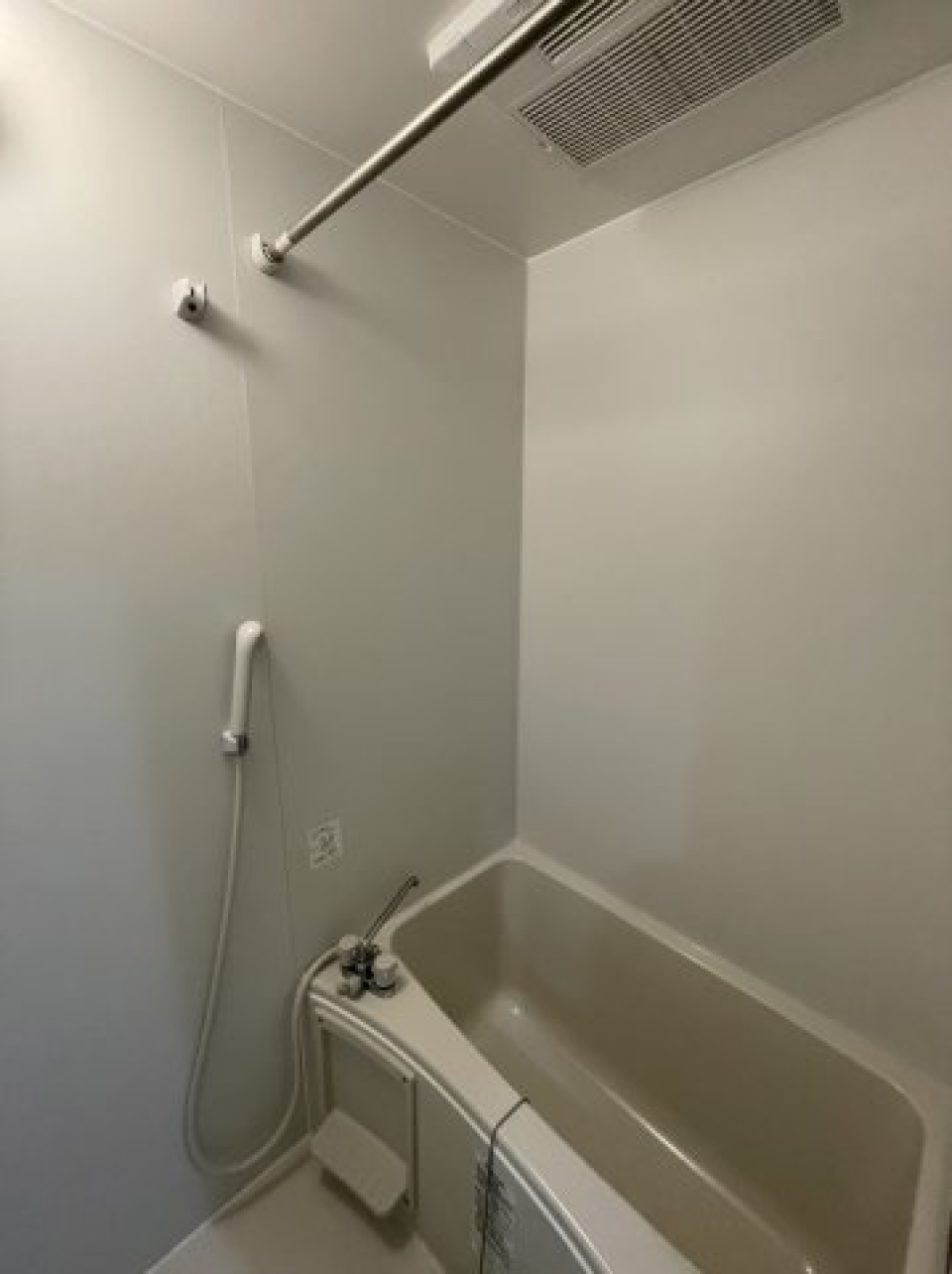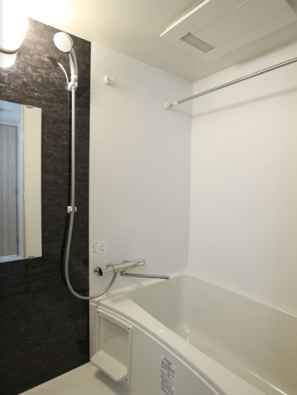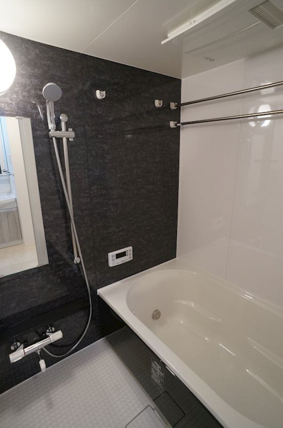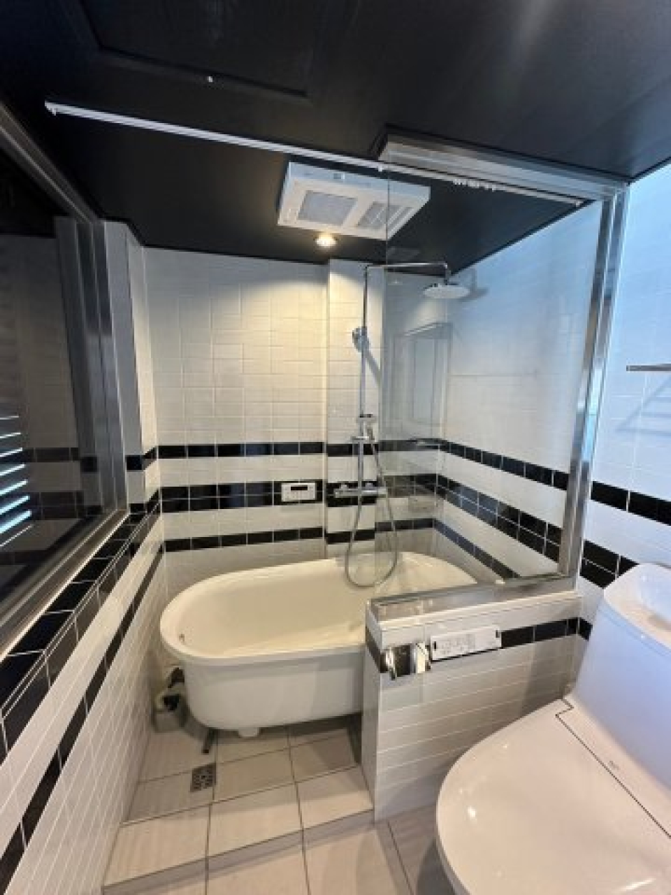足つきバスタブに、シャワーヘッドは天井付きのものと手に持つタイプの2つ付き!