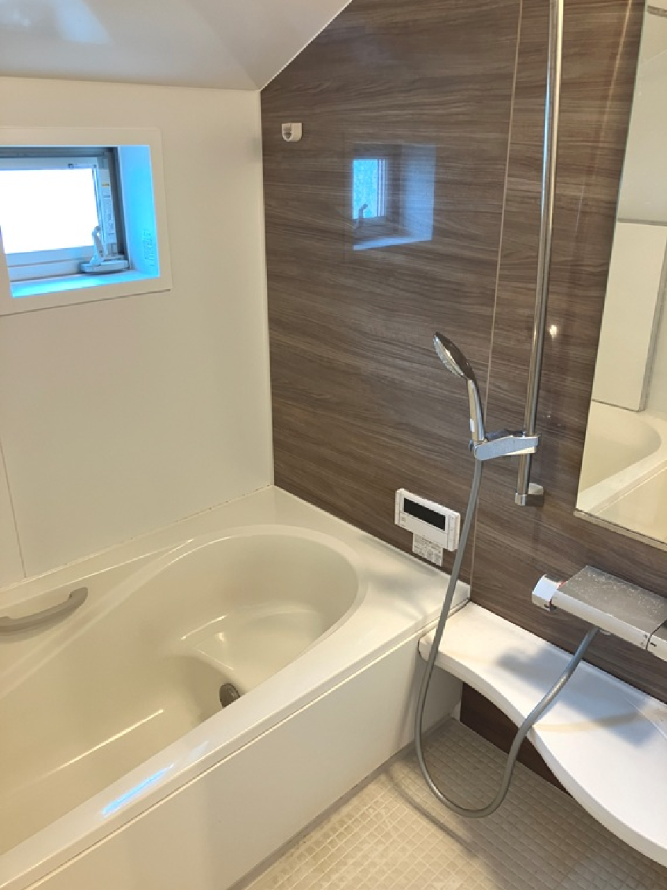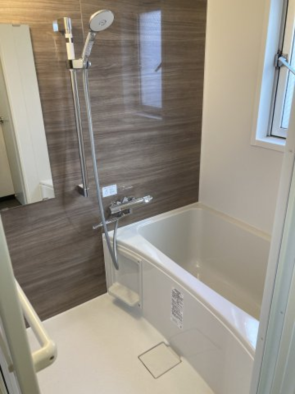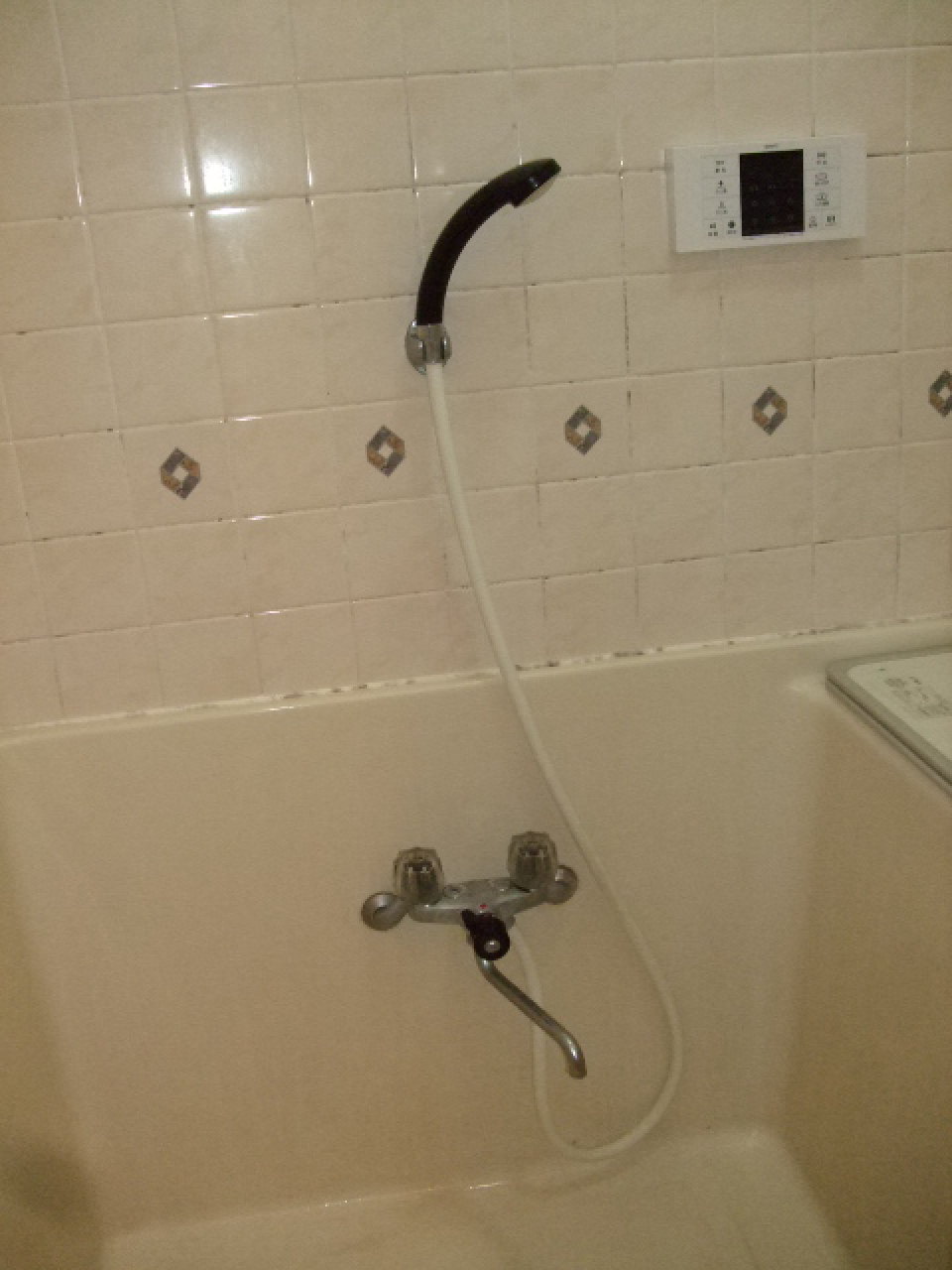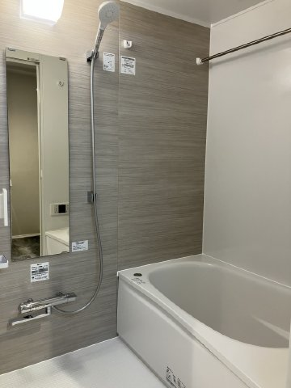 足つきバスタブに、シャワーヘッドは天井付きのものと手に持つタイプの2つ付き!