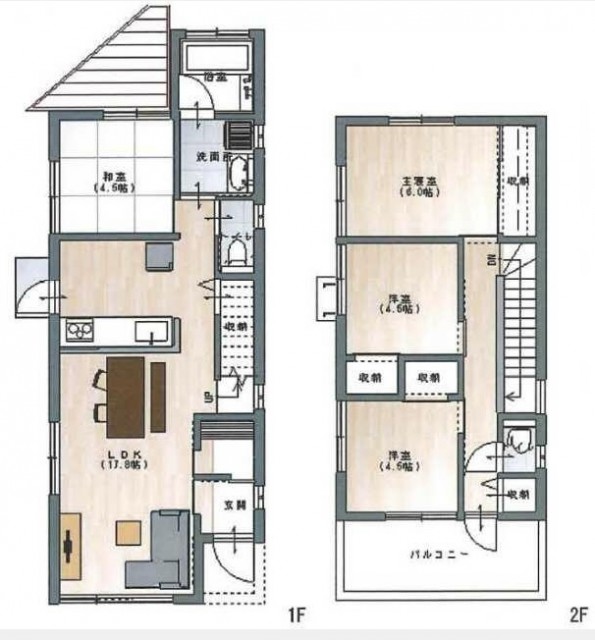 2階には3部屋。6帖、4.5帖、4.5帖と、どの部屋も広い収納を備えていて、窓が特徴的。