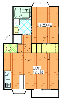 玄関扉を開くとすぐ目の前に、寝室6帖の洋間スペース。こちらのお部屋は北・東方向と2面採光で明るさが保たれております。玄関から右手側は洗面・脱衣スペースと浴室が、左手方向の短い廊下を抜けるとそこには大きな12.5帖のLDKスペースがあります。
