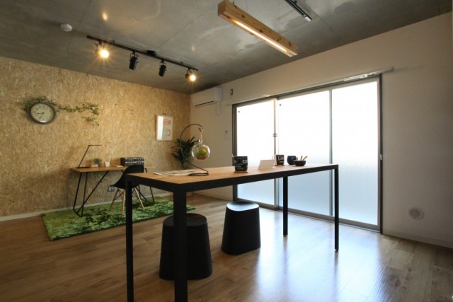 リビングの壁にはOSBボードが使用され緑色との相性がバッチリ、窓から差し込む日差しが柔らかく感じ、吹き込む風は心地よく感じる...。そんな自然を感じながら生活するお部屋です。