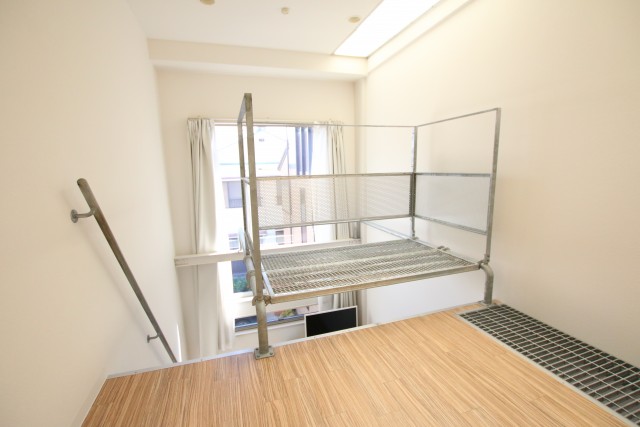 足場階段を上がれば3階には寝室スペースがあります。奥行はなんと約6メートルもあり1部床には道路側溝蓋でよく見る「グレーチング」を使用しております。