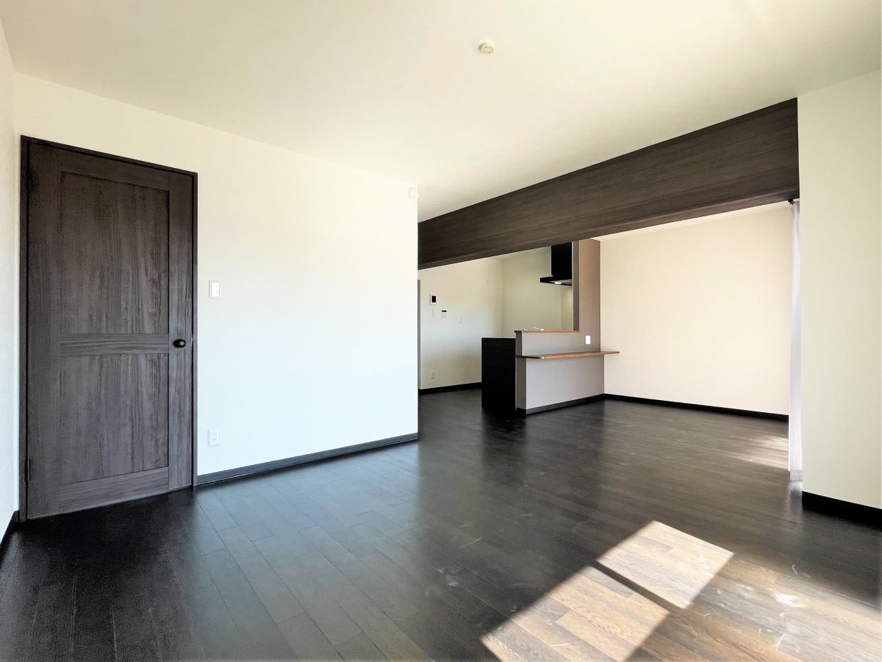 入ってみると明るくて広い空間に、天井を走るダークブラウンの梁と美しいキッチン。