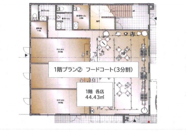 ②1階3分割貸し(フードコート) 使用面積:44.43㎡(13.44坪) 月額賃料(税込):147,000円