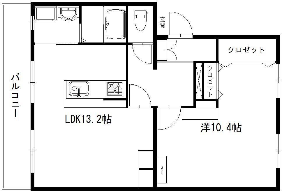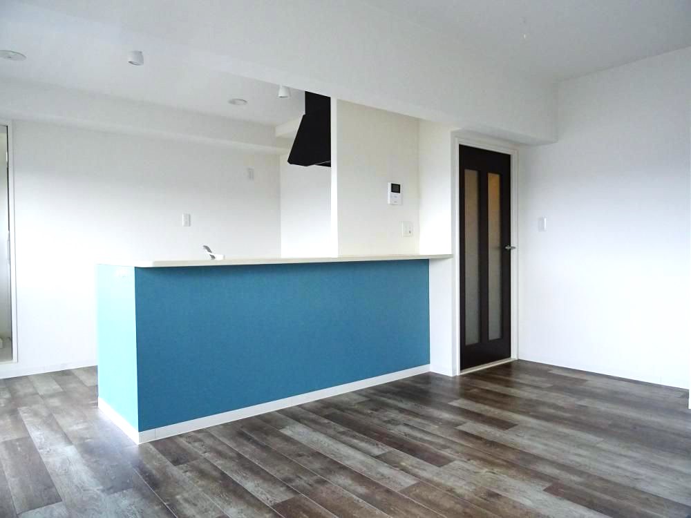お部屋の特徴は、水色のキッチンカウンターがアクセントとなり、お部屋全体に癒しの色彩を醸し出しています。そして、キッチンが対面タイプなので、TVを見ながら、大切な人とおしゃべりしながら、料理や後片付けを楽しむことができます。13.2帖の広々としたリビングルームへの日差しもたっぷり差し込み、明るい空間で過ごせます。10.4帖の洋室には、ダブルベッドを置くスペースがあり、さらに化粧台や作業台として利用できるスペースも完備されています。