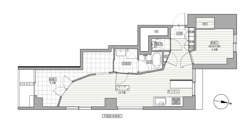 そして4.4帖の洋室は3方を分厚いコンクリートスラブに囲まれた空間であるため防音性に優れた空間になっております。