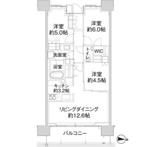 12.6畳のリビングダイニングは東向きのバルコニーに面しています。キッチンは3.2畳の広さで3口のガスコンロが設置されています。腰高のカウンターキッチンで手元が隠れる設計なので、ごちゃごちゃしやすいキッチンのもうまく隠すことができます。家族と、友人と会話を弾ませながら、お料理に専念してください!