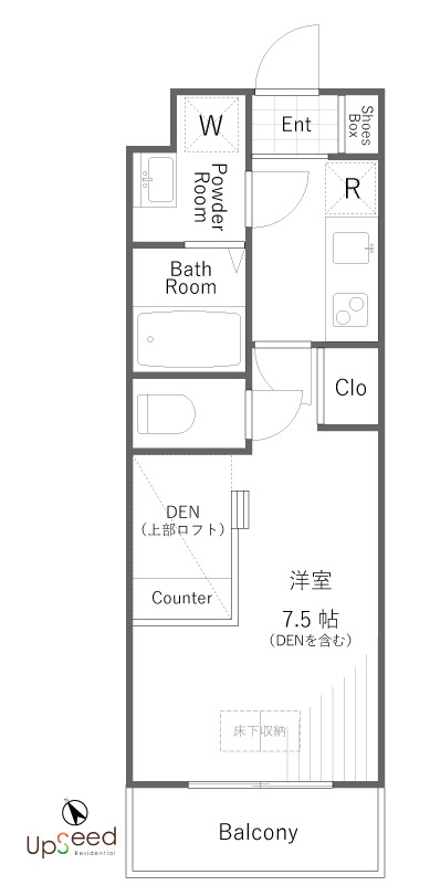 7.5帖の洋室にはカウンターが付いていて、ワークスペースとしてや読書、勉強にぴったりな設計になっています。ロフトになっていて上部に上がると棚があり、お気に入りの置物や本を並べたくなります。