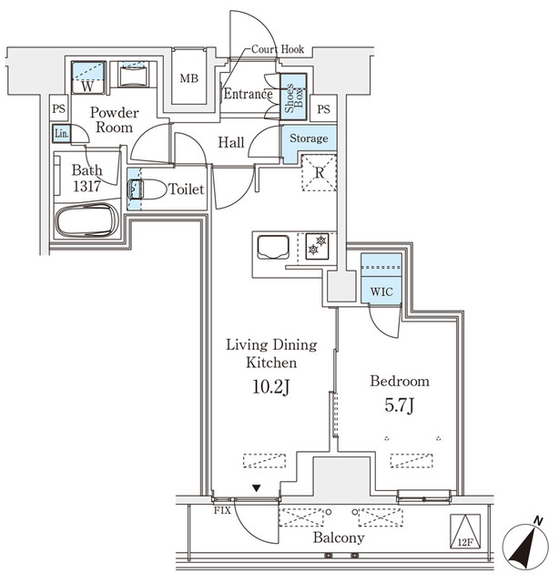 南向きの日当たりの良いこの物件は、10.2帖のリビングと5.7帖の洋室で成り立ちます。