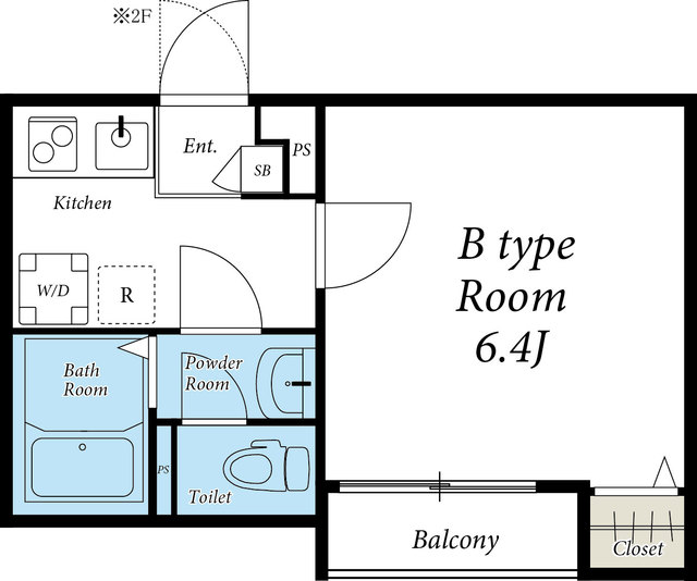 6.4帖の洋室がある1Kのお部屋です。浴室、トイレ、洗面台は独立しています。