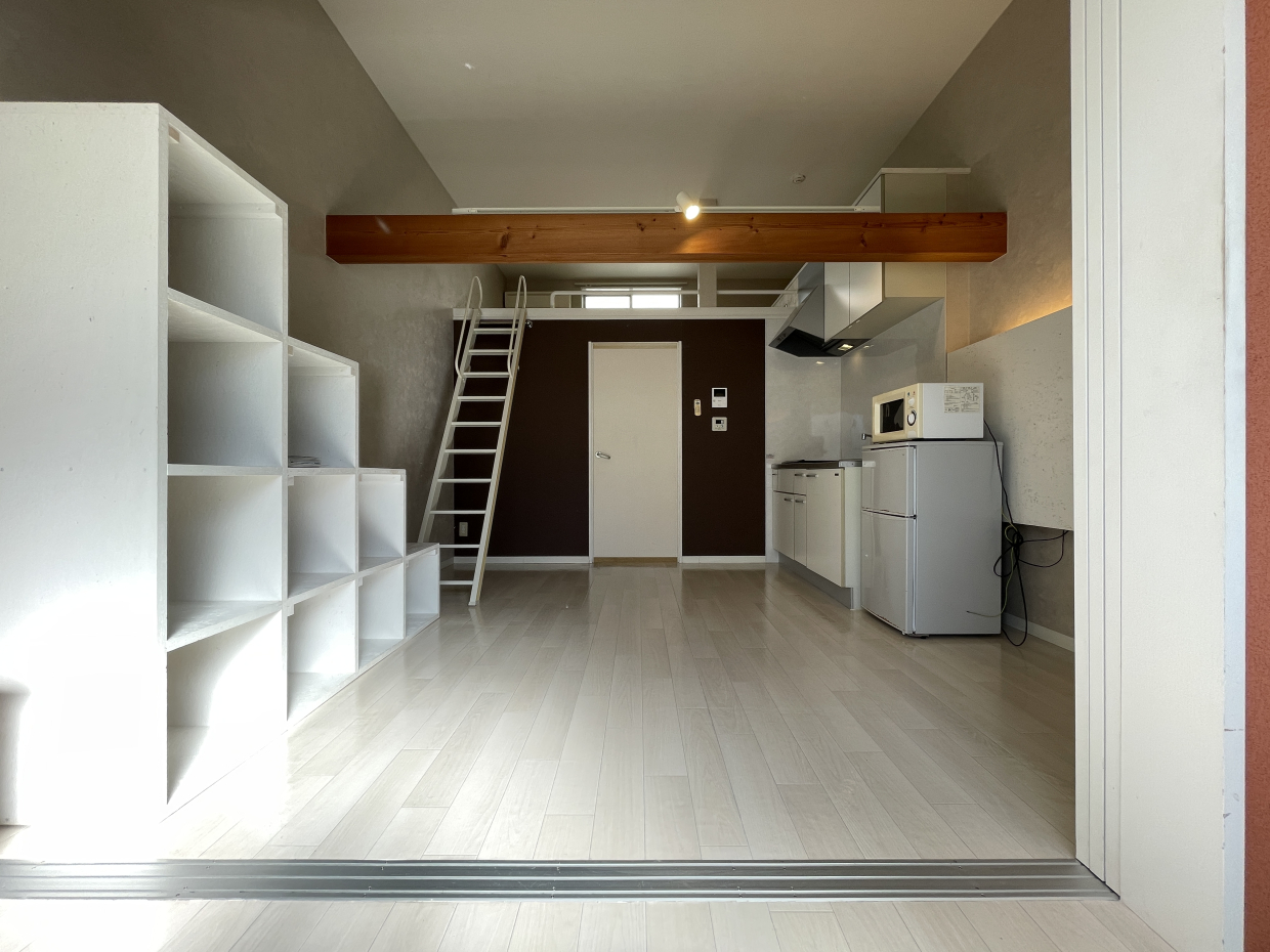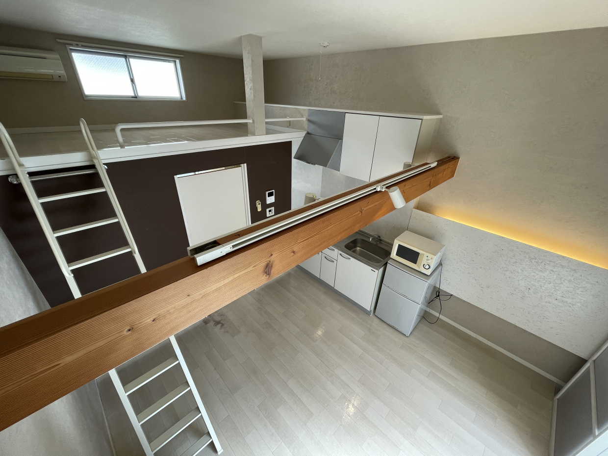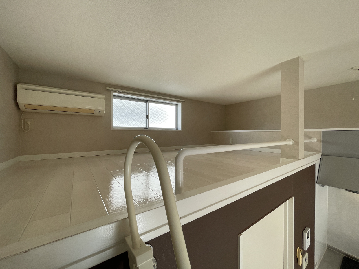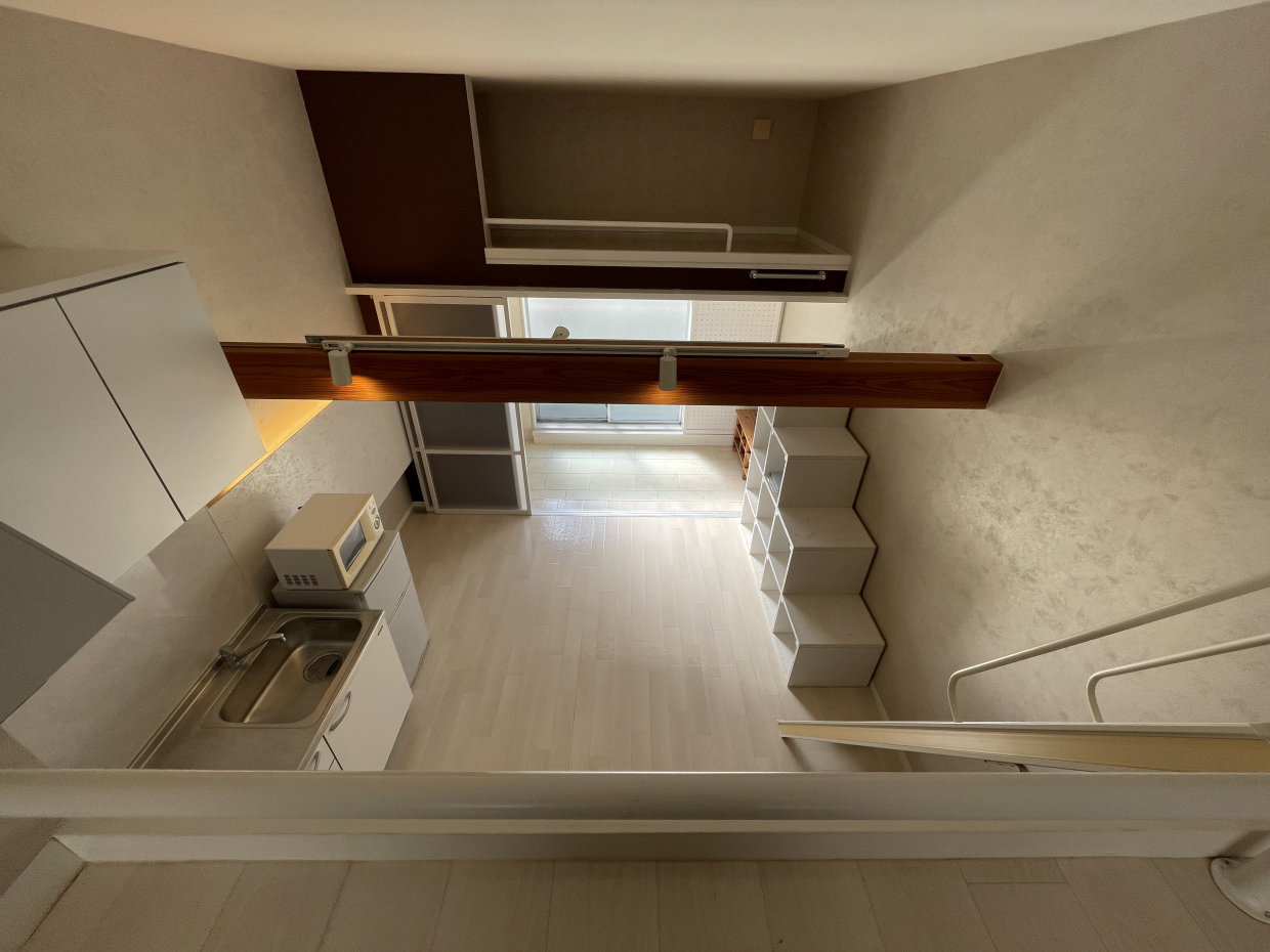 このお部屋の最大の魅力は、なんといっても開放的な高い天井と、そこにある二つのロフトです 。左右に配置されたロフトはそれぞれ4帖と3帖あり、なんと両方にコンセントが完備されています。
