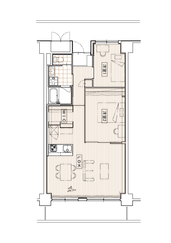 建具もラワン合板の制作建具で、天井高までの高さのドアはこの部屋の意匠的なポイントとなっています。ほかの量産建具と違い、オンリーワンのこの部屋らしさが際立ちます。