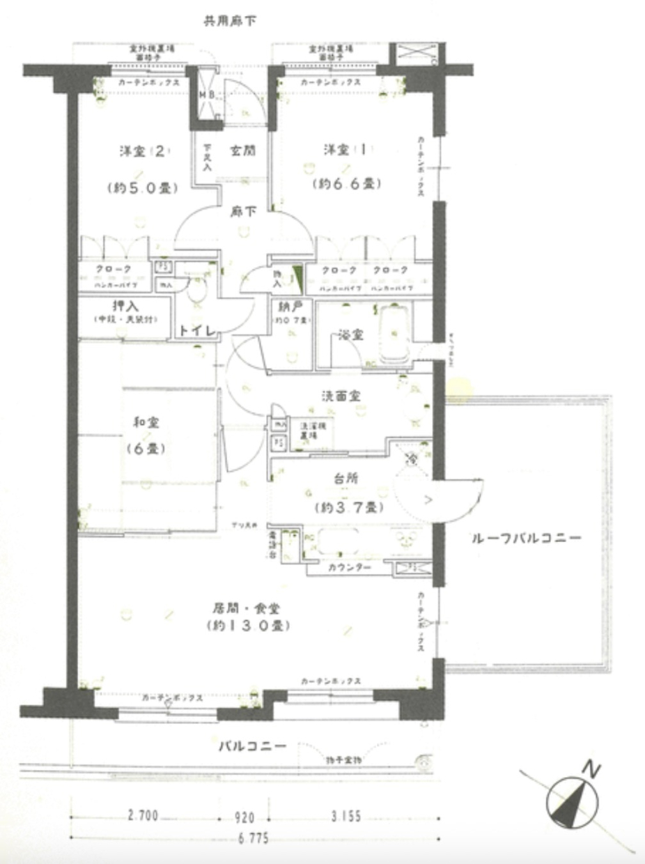 間取りは13畳のLDK、6畳の和室、約6.6畳と約5畳の洋室からなる3LDK。